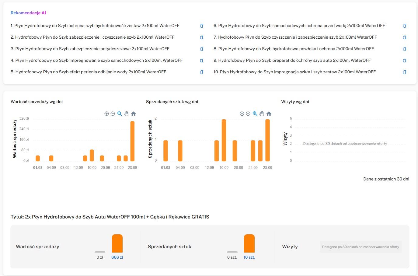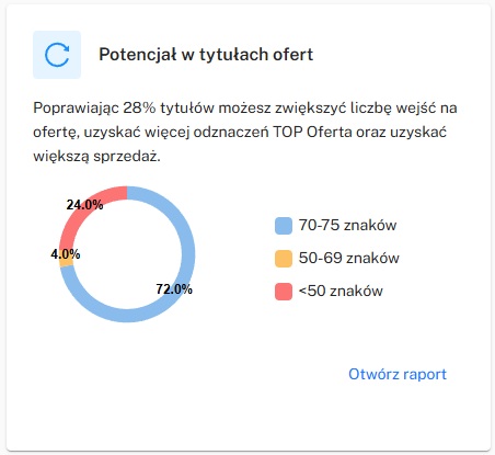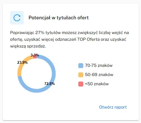 Narzędzie analizuje Twoje oferty, wskazuje, co warto poprawić (np. tytuły, kategorie,ceny) oraz pomaga optymalizować działania – dzięki czemu zwiększasz widoczność,CTR i finalnie sprzedaż.