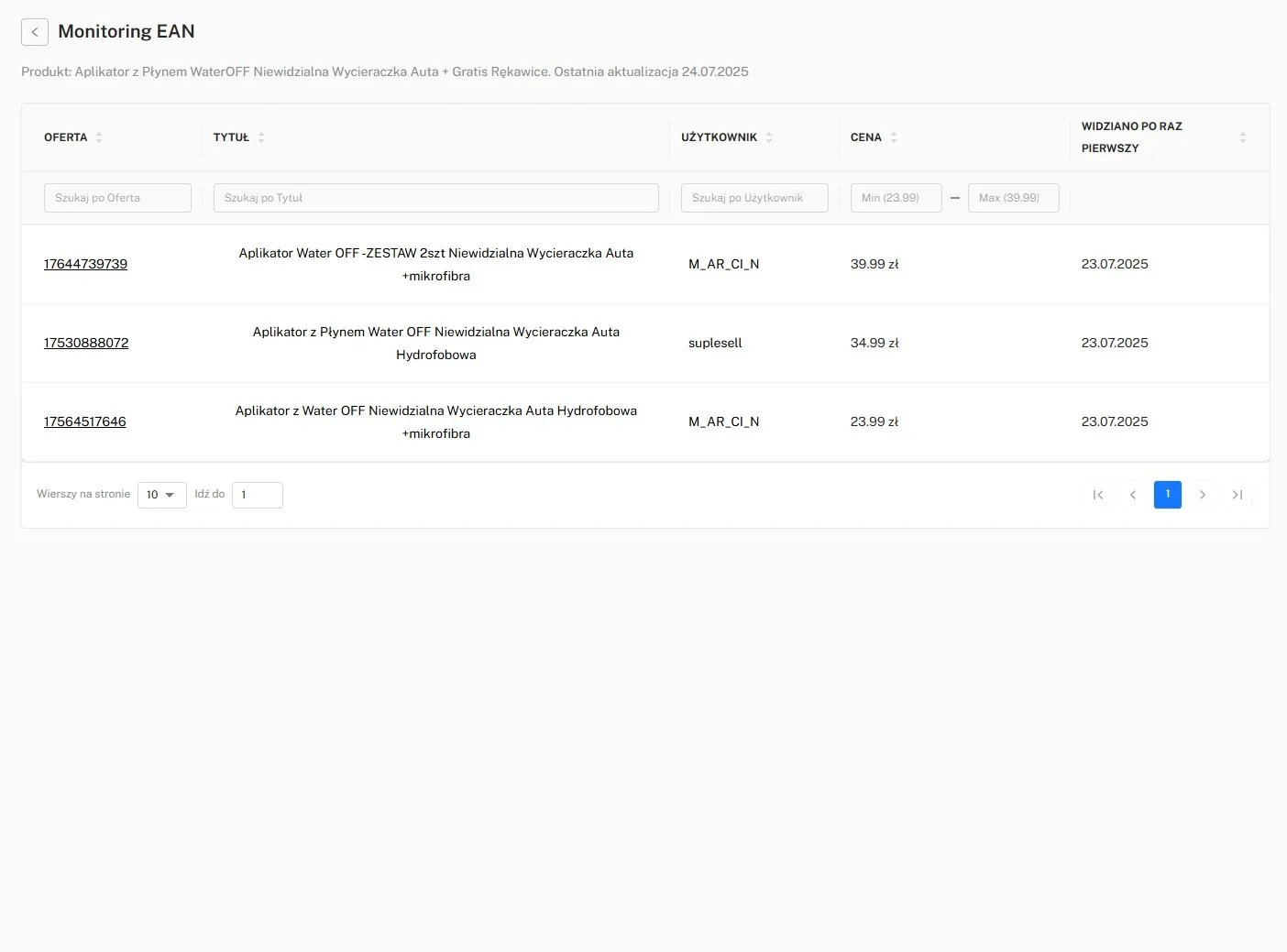 Wystarczy wskazać kody EAN – system śledzi, kto oferuje danyprodukt i powiadamia Cię, gdy pojawi się konkurencja lub zmieni się cena.Możesz od razu zareagować.
