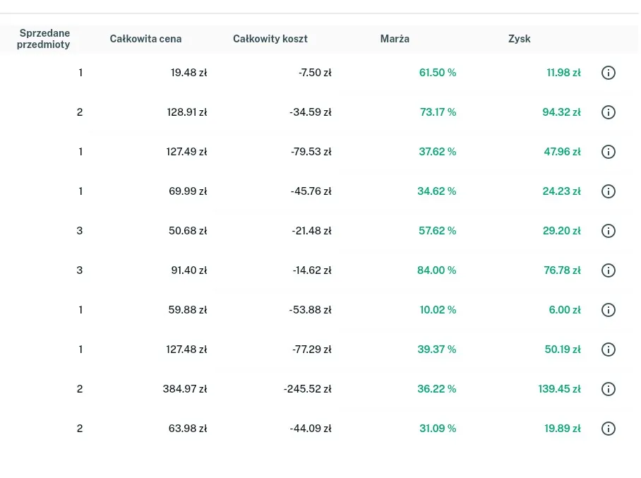 Sprawdź, która oferta zarabia, a która przynosi straty. Wszystkie dane dotyczące kosztów i rentowności poszczególnych ofert oraz całego konta, zebrane w jednym miejscu i przedstawione w czytelny sposób. Wgraj ceny zakupu, aby poznać realny wynik finansowy i efektywność swojej sprzedaży.